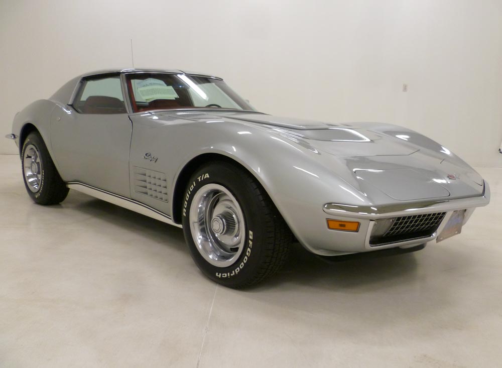 1002W..1970 Corvette Coupe with removable T-Tops, LT1, 350-370 hp, 4 speed, numbers matching original motor, transmission and rear end. Ultra rare and desirable color combination of Cortez Silver lacquer paint with a Monza Red interior. Body-on restored including brakes, carb, distributor, smog system and heater core in excellent condition. One of 1,287 LT1's produced in 1970. Optioned with M21, 3.70 posi, AM/FM stereo radio, rallys wheels and raised white lettered tires. Most all factory correct type components including the spare, jack, jack tools, T-Top bags, seat belts, washer system, smog system, shifter, shielding, air cleaner, spark plug shields, hoses, hose clamps, valve covers, starter, gas door assembly, owners manual, and sales brochure. Documented with the tank sticker, owners manual packet, owner history, vintage photos, maintenance receipts and two 3-ring binders. Production date of June 25th, 1970 and delivered new by The Karl Chevrolet Company in New Canaan CT (dealer code 289 in zone 2) per the official NCRS/GM Shipping Data Records (SDR). Looks, runs, and drives excellent. CC:1/+2 $119,000.00