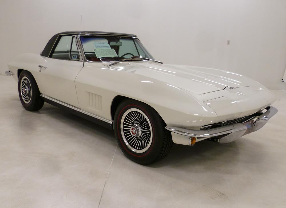 1027U..1967 Corvette Convertible, two tops, 327-300 hp, factory air, powerglide, numbers matching original motor, transmission and rear end with CCAS/Grenning Engine Stamp Affirmation, also has factory original body/trim tag, 73,121 actual miles. Ermine White paint with Rally Red interior and Black soft top. Very rare and desirable color combination especially with the documented options. Body-off restored in excellent show condition. These type restorations normally cost between $125,000.00 to $150,000.00. Optioned with factory air, powerglide, power steering, power brakes, power windows, telescopic, speed warning, black vinyl auxiliary hardtop, 3.36 rear, SS brakes, AM/FM radio, tinted glass, B.O. aluminum wheels, and red stripe radials. A/C retrofitted to R-134A. Most all factory correct type components including the spare, seat belts, washer system, shifter, shielding, air cleaner, spark plug shields, hoses, hose clamps, expansion tank, radiator, gas door assembly, glove box door, owners manual, sales brochure, and T-3 headlights.