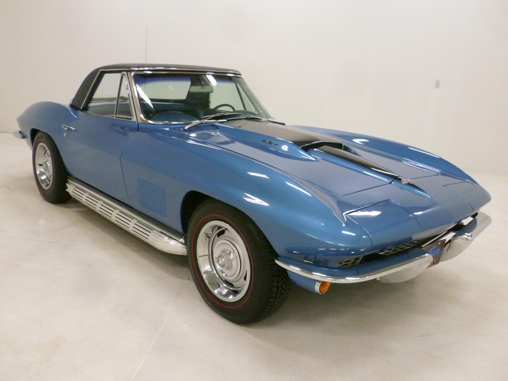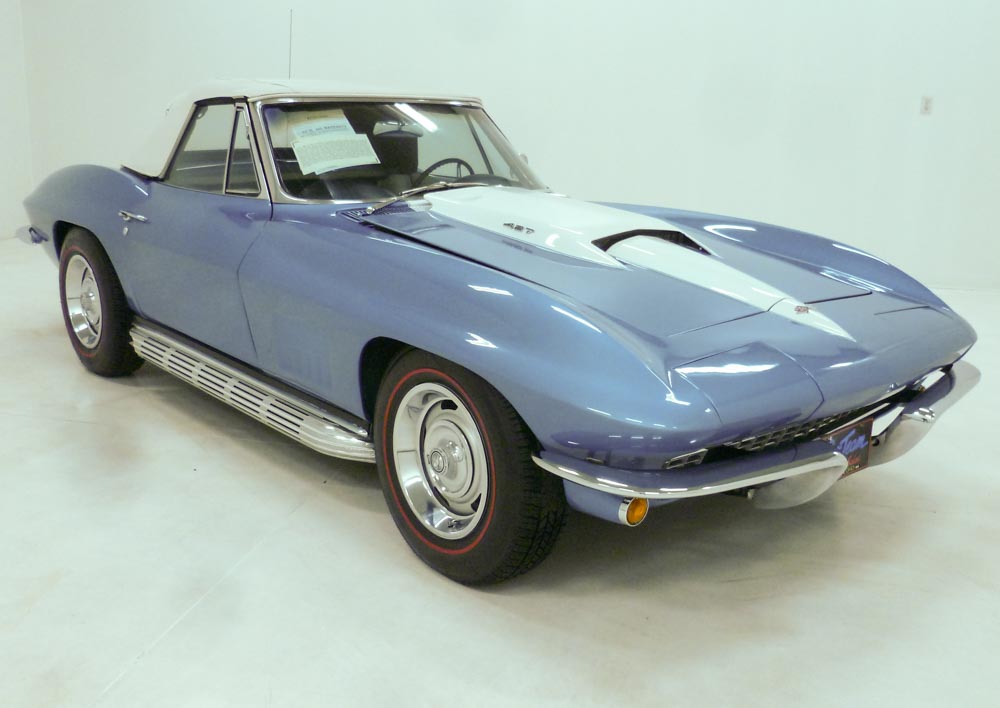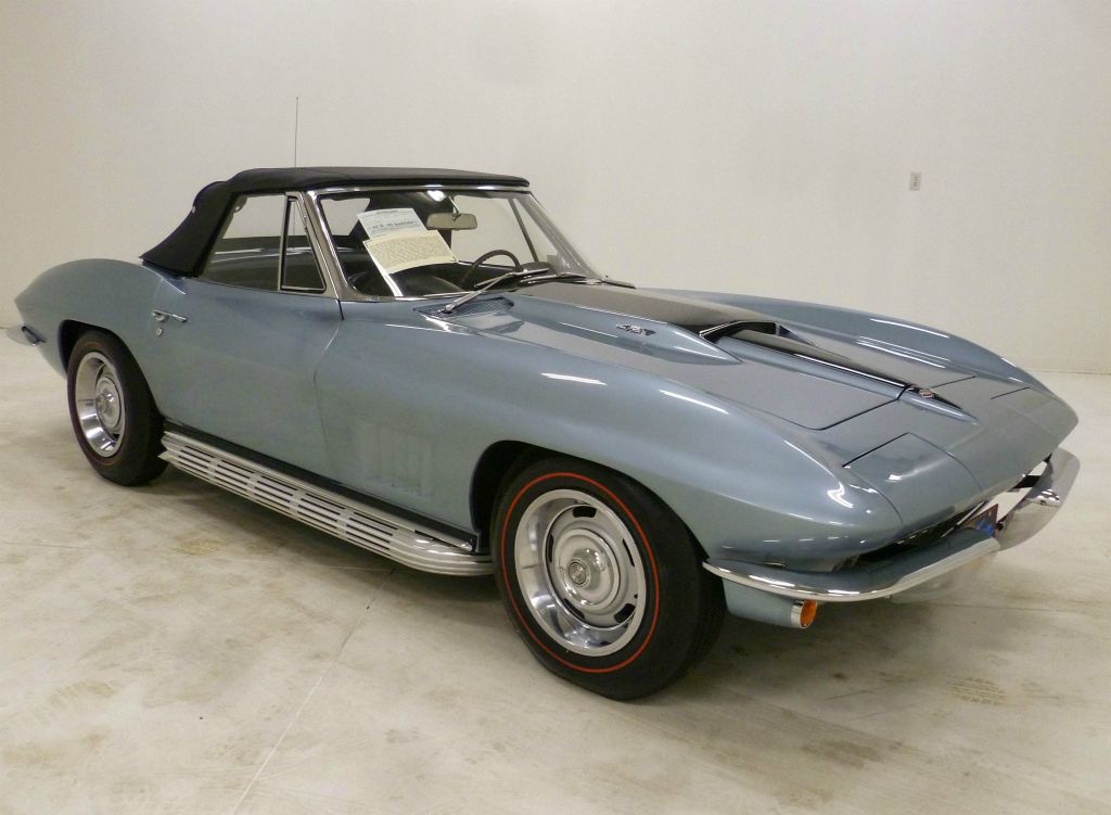 1042Q..1967 Corvette Convertible with two tops, 327-350 hp, 4 speed, numbers matching original motor with CCAS/Grenning Engine Stamp Affirmation, also has factory original body/trim tag, 42,071 actual miles. Lyndale Blue paint with Black interior and White soft top. Original unrestored low-mile car in excellent condition. Bloomington Benchmark, Bloomington Gold certified, Bloomington Gold Survivor, multiple NCRS Top Flights, Bloomington Special Collection 3-times, Gold Concours award and Triple Crown award. Known as the Five Dollar Special! These original unmolested cars are among the rarest of rare and are rising to the top of the Corvette food chain as unrestored cars are used as guideposts for restorers, shining a light on the way vehicles were originally built. The solid feel of an excellent unrestored car cannot be overstated! This car is one of the elite few recipients of America’s most prestigious Corvette awards, the happy result of a lifetime of diligent care and discerning use. Unrestored and original!! It was judged worthy of Bloomington Gold Certification, Survivor and Benchmark honors, the latter being the most important of all to the demanding collector. Benchmark Certification recognizes each recipient as not only unrestored—a quality recognized in Survivor judging—but also that it remains in showroom condition, exactly as it was upon delivery from the factory with the exception of aging. These qualities make it the perfect source of reference for a top-quality restoration of a like car, ergo the term “Benchmark.” Benchmark Certification is only awarded to cars that have achieved both Gold and Survivor on the same weekend, qualify in all four Survivor categories. Benchmark is, by definition, the most important distinction in the entire Corvette judging regime, one awarded to fewer than 230 Corvettes 1953 to 1972 and less than 70 were 1967s as of this writing—including this jewel. The expenses involved in obtaining these awards could surely exceed $20,000.00. The engine, transmission and rear end are original to this car. Optioned with factory side exhaust (which was added and we have the original undercar exhaust and the rear valance), telescopic, auxiliary hardtop, M-21, 3.70 posi, SS brakes, AM/FM radio tinted windshield, rallys, redline tires, and custom fit car cover. Most all factory correct type including the spare, jack, jack tools, clear floor mats, Delco shocks, seat belts, washer system, shifter, shielding, air cleaner, alternator, distributor, spark plug shields, hoses, hose clamps, carb, window glass, valve covers, starter, ball joints, expansion tank, radiator, gas door assembly, bowtie mirror, glove box door, warranty book, owners manual, sales brochure, and T-3 headlights. Documented with the dealer invoice, tank sticker, warranty book/P.O.P., owner history, show history, old titles, photo album, certificates/awards, judging sheets, ribbons, and no less than five 3-ring binders. Also has an affirmation by CCAS/Grenning as to the legitimacy and originality of the engine block, stamp pad, and the engine stamp. Editorialized multiple times as the Five Dollar Special!! Looks, runs, and drives excellent as the optional 350 hp engine proved to be one of the most civilized engines produced in 1965 to 1967. $149,000.00