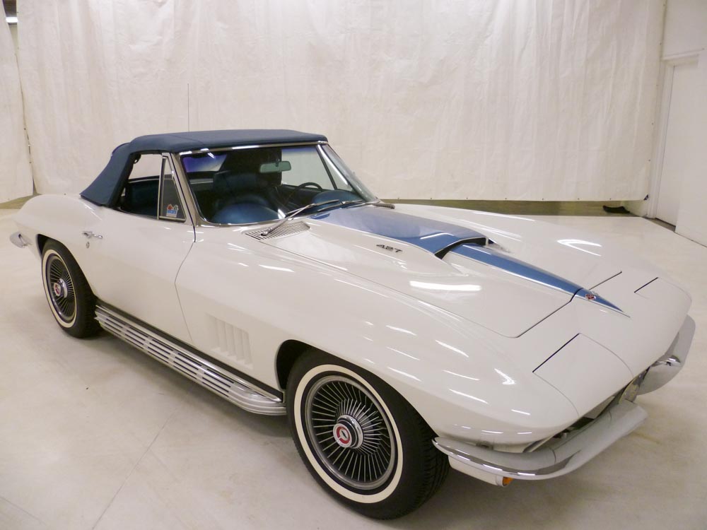 1018U..1967 Corvette Convertible with Two Tops, 427-435 hp, 4 speed, numbers matching original motor, transmission and rear end, also has factory original body/trim tag. Ermine White paint with Bright Blue stinger, Bright Blue interior, and Blue soft top. Rare documented color combination that has been body-off restored and subsequently shown earning the Bloomington Gold certification and multiple NCRS Top Flight awards. NO HIT GM front end with grill tab in place. Paint has aged gracefully but has some checking. The standard bore motor was also rebuilt during restoration. Also has an affirmation by CCAS/Grenning as to the legitimacy and originality of the engine block, stamp pad, and the engine stamp. Optioned with factory side exhaust (born with), headrest seats, transistorized ignition, black vinyl auxiliary hardtop, M-21, 4.11 posi, SS brakes, AM/FM radio, tinted windshield, Kelsey B.O. aluminum wheels and your choice of 7.75x15" vintage red stripe tires or modern white stripe radials. Most all factory correct type components including the spare, jack, jack tools, clear floor mats, seat belts, washer system, shifter, shielding, braided wires, air cleaner, alternator, distributor, hoses, hose clamps, carbs, starter, valve covers, radiator, five Kelsey B.O. aluminum wheels, gas door assembly, glove box door, owners manual, sales brochure, and T-3 headlights. Documented with the NCRS/GM validated tank sticker, CCAS/Grenning Engine Stamp Affirmation, warranty book/P.O.P., restoration photos/receipts, Bloomington and NCRS judging sheets, NCRS Confirmation of Judging Awards, owners manual packet and multiple 3-ring binders. Also has extensive owner history including John Danos, George Page and Michael Seskin. Just in from the past owner of 25-years. Production date of May 15th, 1967 and delivered new by Rosenthal Chevrolet in Arlington, VA (dealer code 475 in Zone 14) per the official NCRS/GM Shipping Data Records (SDR). Looks, runs, and drives excellent. CC:+2 Consigned to Mecum Kissimmee Collector Car Auction January 15th - 17th, 2026