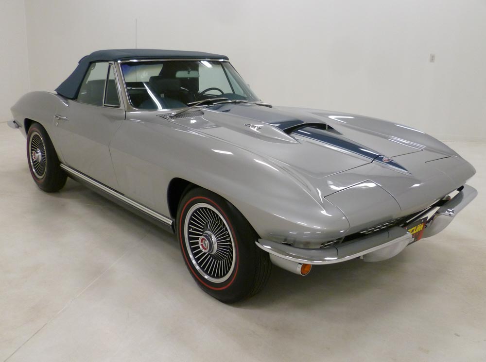 1025U..1967 Corvette Convertible with Two Tops, 427-400 hp, 4 speed, numbers matching original motor and transmission, also has factory original body/trim tag with CCAS/Grenning Trim Tag Affirmation, 2 or 3 owner car with 62,943 actual miles. Silver Pearl paint with Teal Blue stinger, Teal Blue interior and Teal Blue soft top. Body-off restored in show condition. Also has an affirmation by CCAS/Grenning as to the legitimacy and originality of the engine block, stamp pad, and the engine stamp. These type restorations normally cost between $125,000.00 to $150,000.00. This restored Corvette has yet to be shown, creating an exciting opportunity for the next owner to exhibit the car and compete for trophies, awards, and recognition! Optioned with power windows, leather, headrest seats, auxiliary hardtop, M-21, 3.36 posi, SS brakes, AM/FM radio, tri-power, tinted glass, B.O. aluminum wheels and vintage 7.75x15" red stripe tires. Most all factory correct type components including the spare, jack, clear floor mats, seat belts, washer system, shifter, shielding, braided wires, air cleaner, alternator, hoses, hose clamps, starter, gas door assembly, glove box door, warranty book, owners manual, sales brochure, and T-3 headlights. Documented with warranty book/P.O.P., CCAS/Grenning Engine Stamp Affirmation, CCAS/Grenning Trim Tag Affirmation, owners manual packet, previous owner's title, numbers sheet and 3-ring binder. Only 2,101 427-400 hp were produced in 1967. From the past owner of 19 years. Production date of September 21, 1966 and delivered new by Huebsch Chevrolet in Prairie Du Chien, WI (dealer code 292 in zone 61) per the official NCRS/GM Shipping Data Records (SDR). Looks, runs, and drives excellent. CC:1 Consigned to Mecum Kissimmee Collector Car Auction January 15th - 17th, 2026